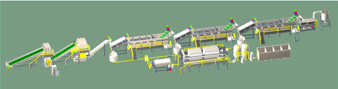 此套生產(chǎn)線主要處理日常生活中所廢舊的牛奶瓶、化妝品瓶、洗發(fā)水瓶、藍(lán)桶、廢舊框、塑料椅、塑料桶等HDPE、PP、PO等浮水硬質(zhì)塑料的再生回收清洗,進(jìn)而可以進(jìn)行造粒后再利用。從節(jié)能、環(huán)保方面為用戶考慮,采用不同的方案流程,適合不同廢塑料的回收,提供配套的分揀輸送帶、高速清洗機(jī)、塑料表面不干膠標(biāo)簽的去除、金屬分離器、水循環(huán)處理系統(tǒng)等。